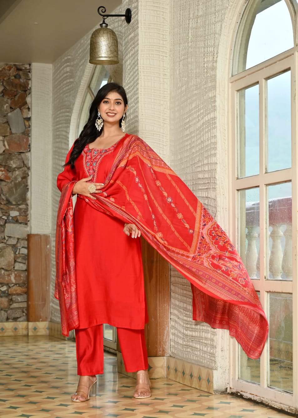 Step into timeless elegance with this stunning red cotton suit set from Sunheri. Crafted for...