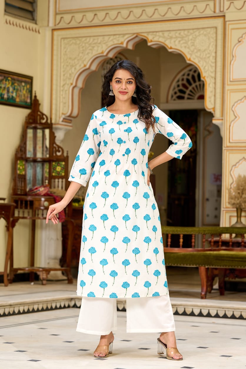 White & Blue Floral Printed Cotton Kurta Set