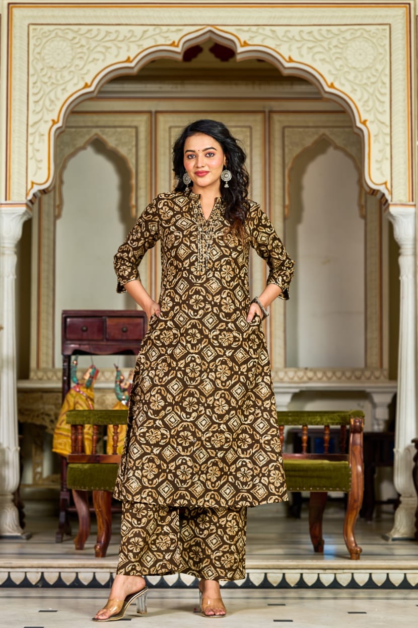 Elevate your ethnic wardrobe with this Brown Handblock Printed Cotton Kurta Set from UVULA, where...