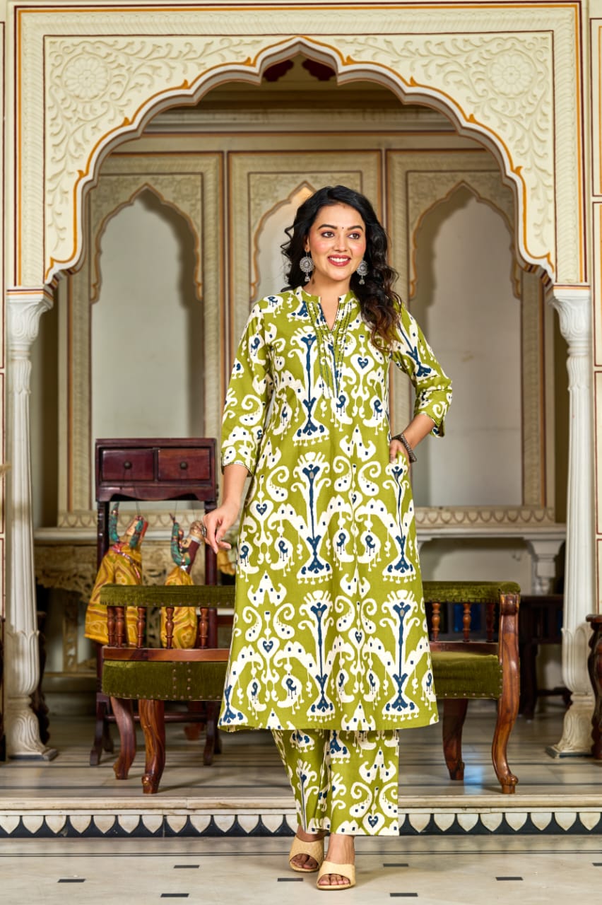 Olive Green Ikat Printed Cotton Kurta Set