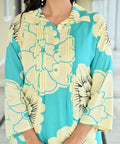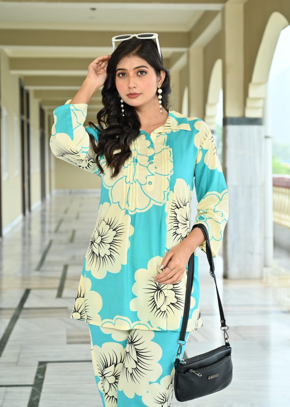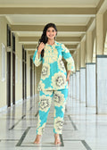 Add a splash of freshness to your wardrobe with this Uvula Aqua Blue Floral Co-Ord Set, designed for effortless style and comfort. Crafted from soft, breathable cotton, this co-ord features an eye-catching oversized floral print in cream and black, giving it a chic and modern ethnic appeal.