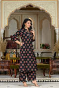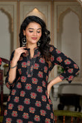 Make a bold style statement with this chic black cotton kurti, designed for women who love comfort without compromising on elegance. Featuring vibrant traditional motifs all over, this kurti stands out with its beautifully embellished neckline that adds a touch of sophistication. Perfect for everyday wear, office attire, and festive gatherings, this versatile piece is a must-have in your ethnic wardrobe.