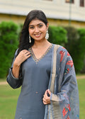 Charcoal Grey Embroidered Lawn Suit with Digital Floral Dupatta