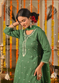 Add a touch of regal elegance to your ethnic collection with this Uvula Emerald Green Embroidered Cotton Suit Set. Beautifully adorned with delicate thread embroidery and mirror work on the neckline, this outfit brings together tradition and grace. Made from soft, breathable cotton, it ensures both comfort and sophistication for festive occasions, family gatherings, or cultural events.