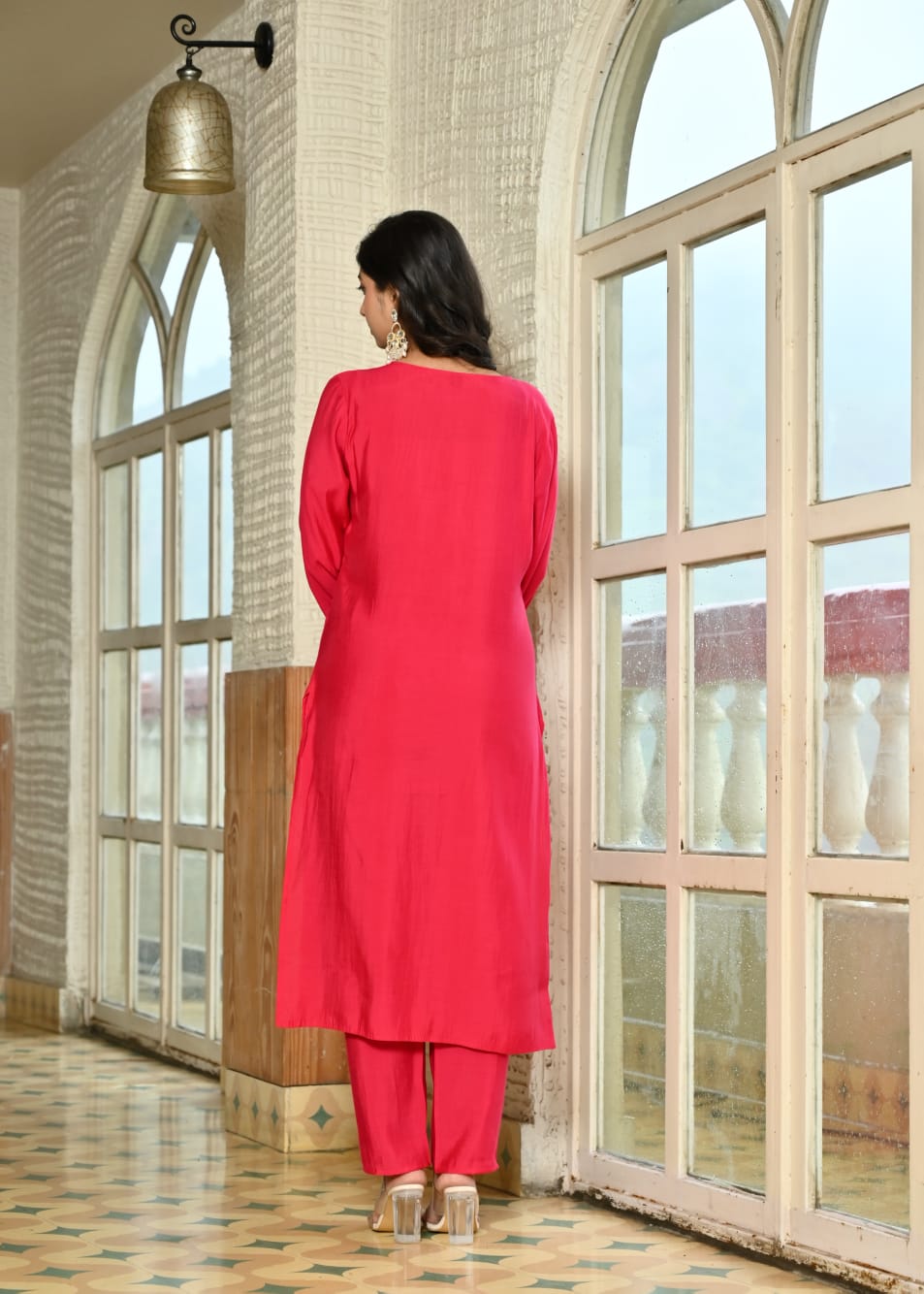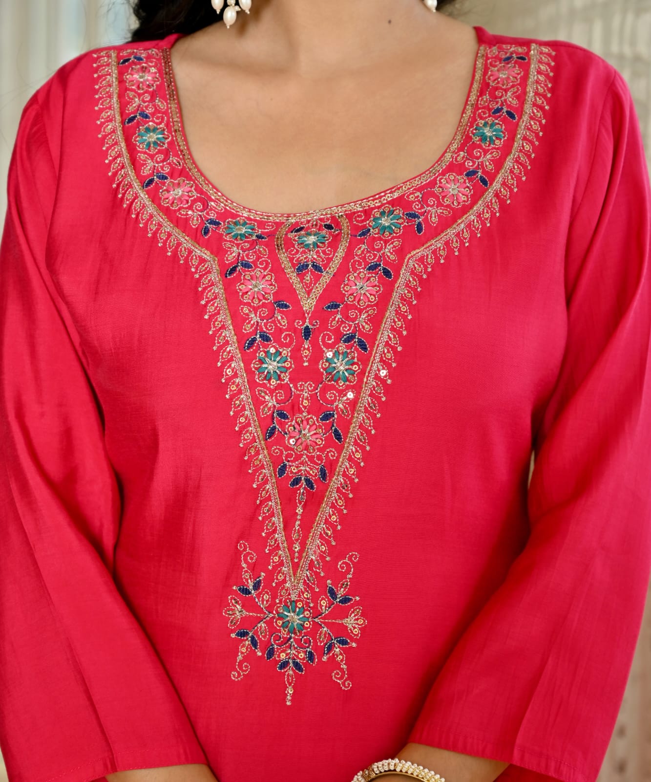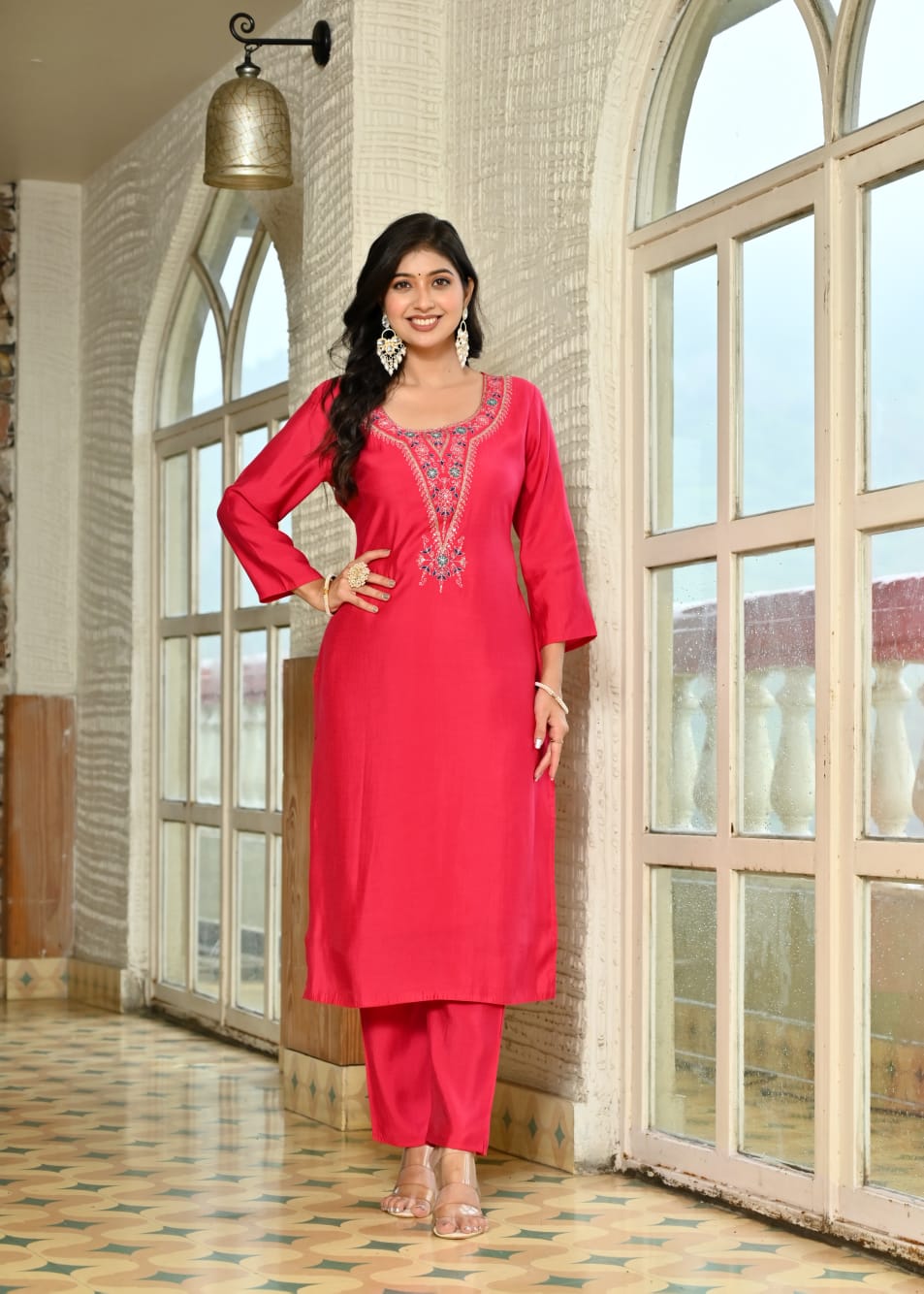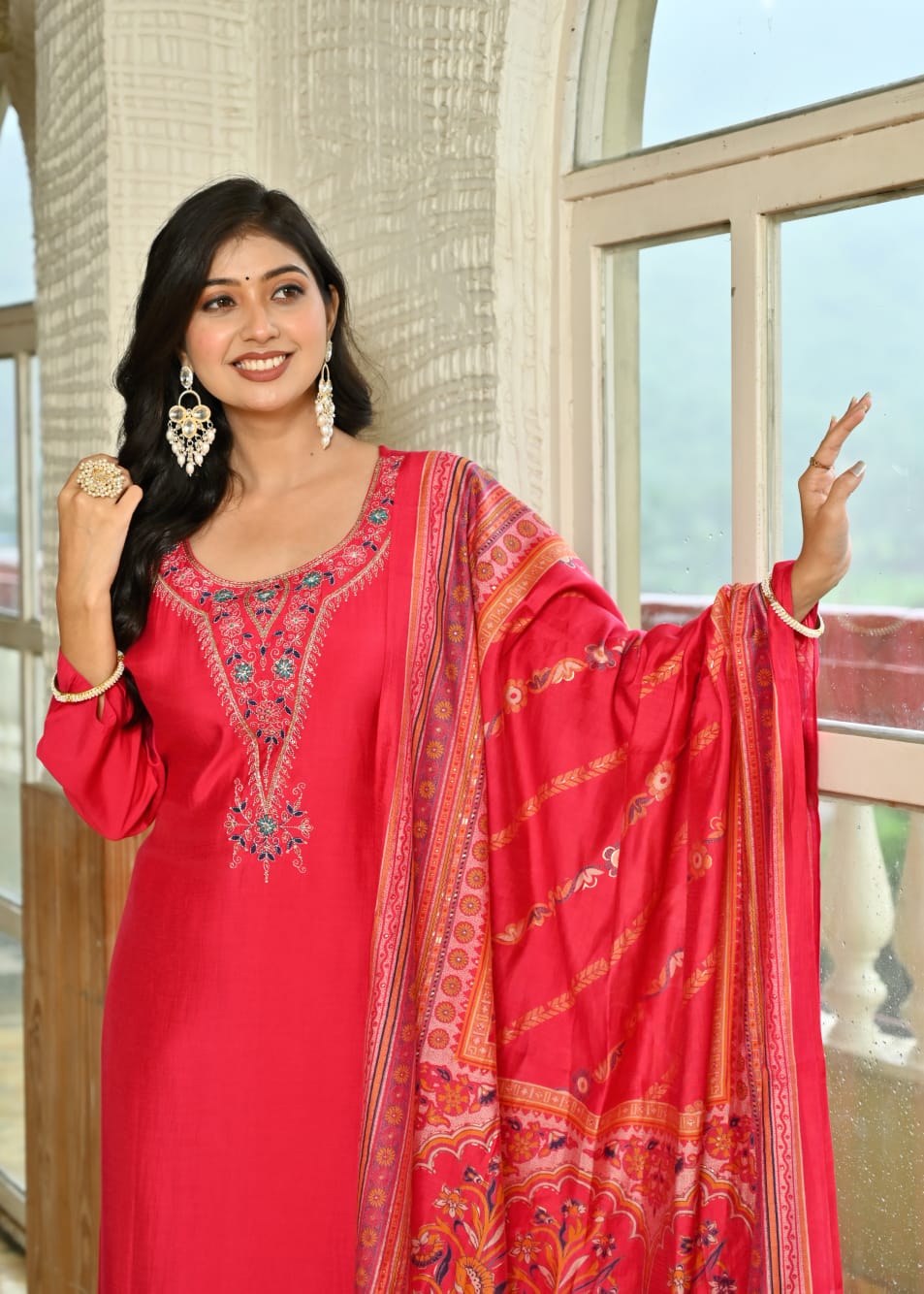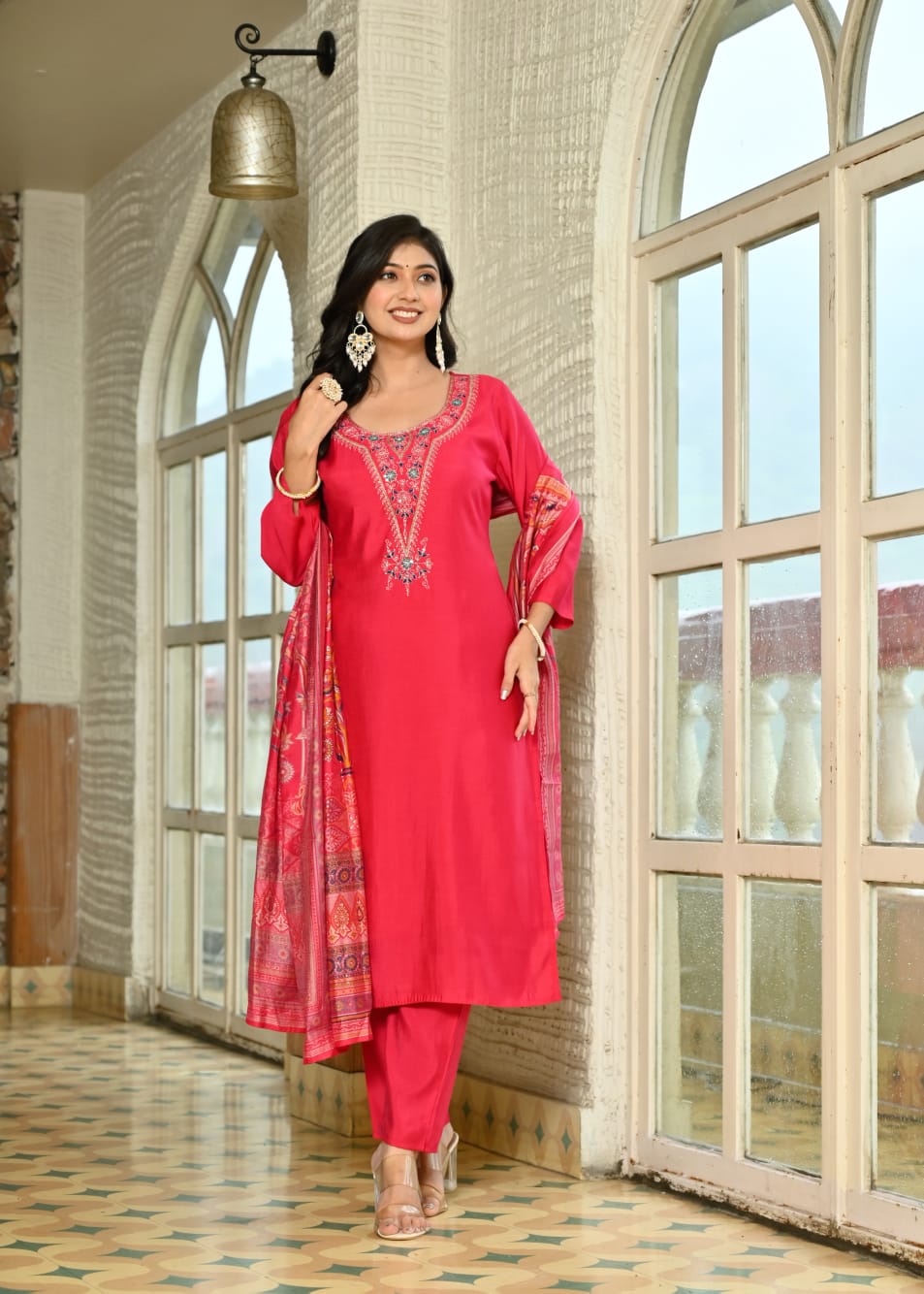 Step into elegance with this magenta cotton suit set, a perfect blend of comfort and style. The kurta features intricate thread embroidery on the neckline, adding a refined traditional touch. Paired with solid cotton pants and a vibrant printed dupatta, this outfit is ideal for festive occasions, family gatherings, or office wear.