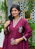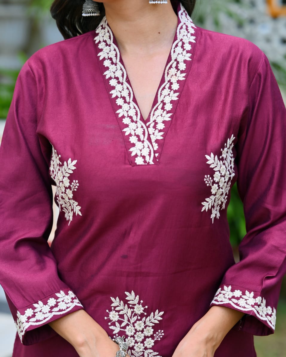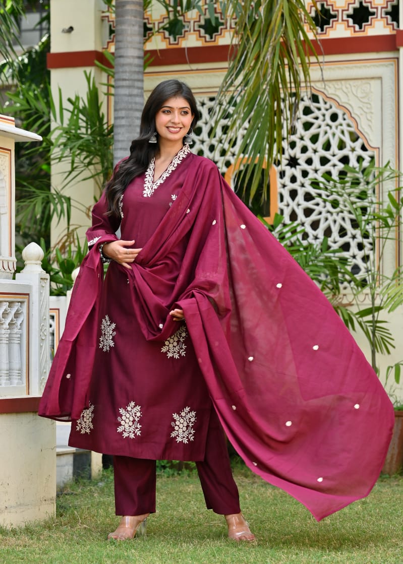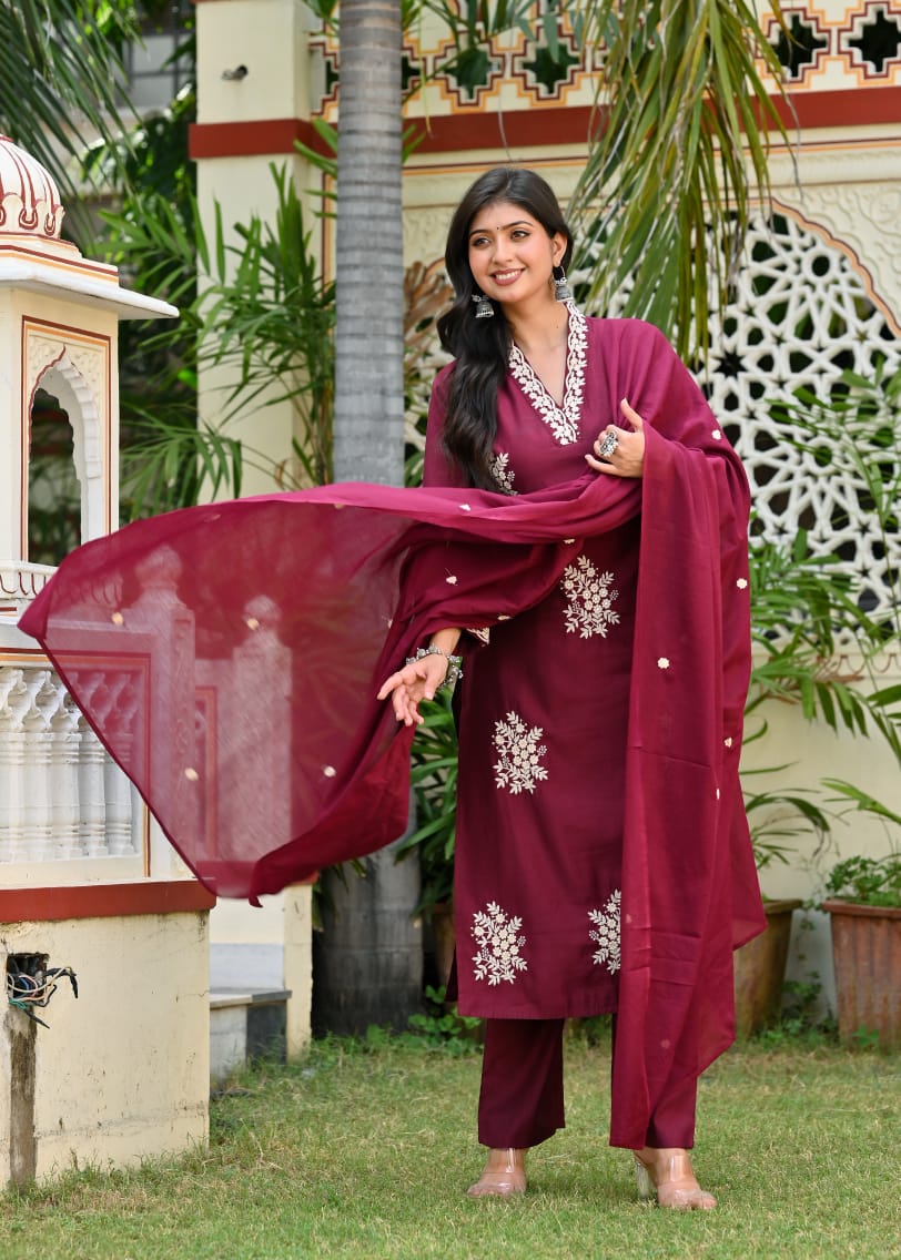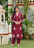 Step into elegance with this Uvula Maroon Embroidered Cotton Suit Set, a perfect blend of sophistication and comfort. Crafted from premium cotton, this stunning outfit features delicate white thread embroidery on the neckline, sleeves, and hemline, creating a timeless ethnic charm.