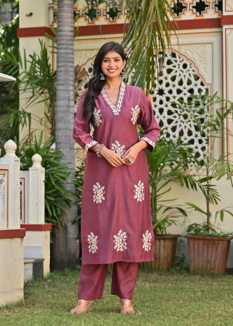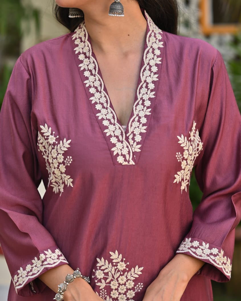 Embrace understated elegance with this Uvula Mauve Embroidered Cotton Suit Set, a perfect pick for festive and semi-formal occasions. Crafted from premium soft cotton, the kurta features intricate white thread embroidery along the neckline, sleeves, and hemline for a sophisticated finish.