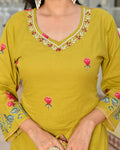 Bright, bold, and beautiful — this Uvula Mustard Yellow Floral Printed Cotton Suit Set is the perfect mix of comfort and festive elegance. Crafted from premium breathable cotton, the outfit showcases exquisite floral prints in striking red and green hues, bringing a lively charm to your ethnic wardrobe.