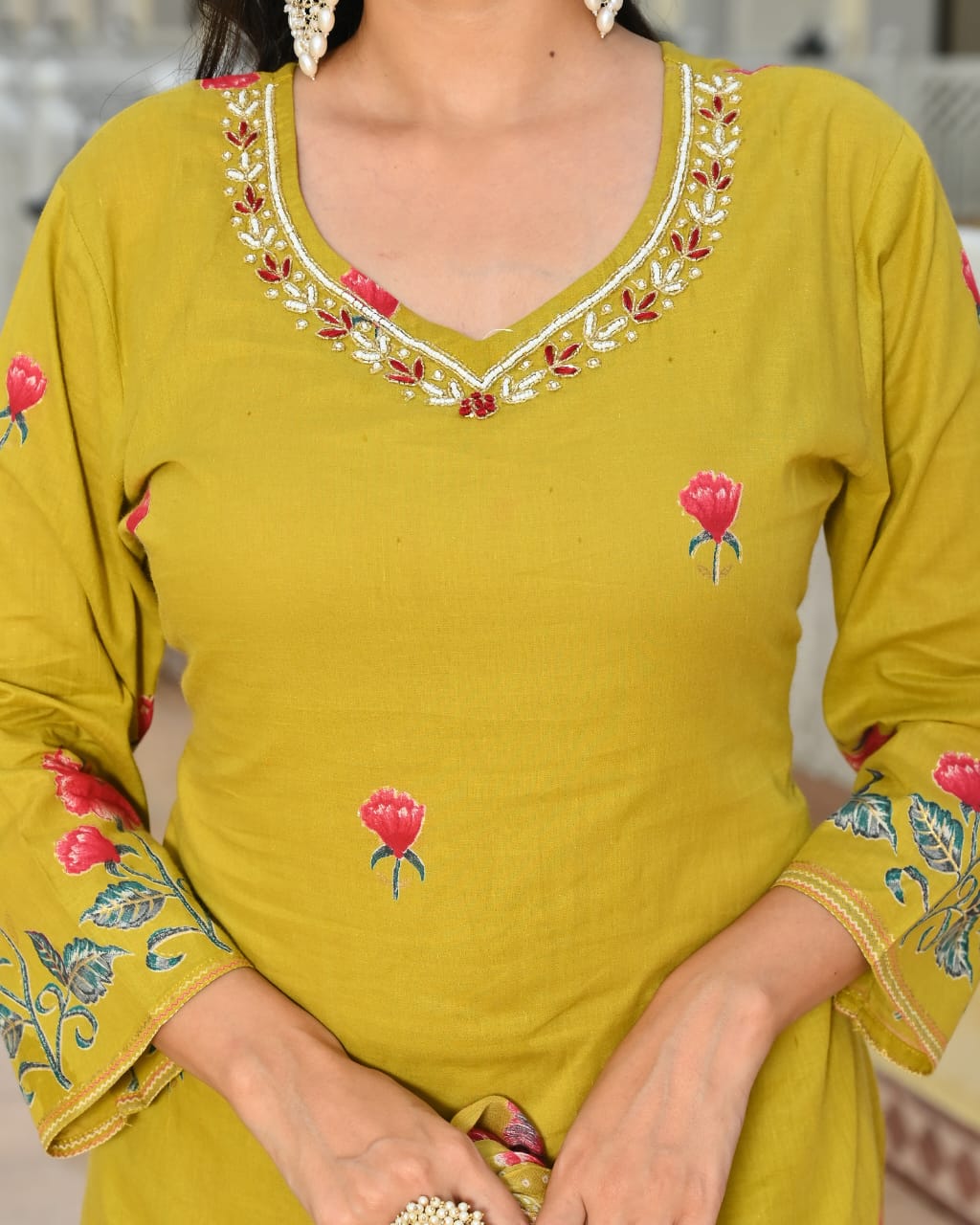 Color: Mustard Yellow with Red & Green Floral Motifs