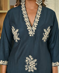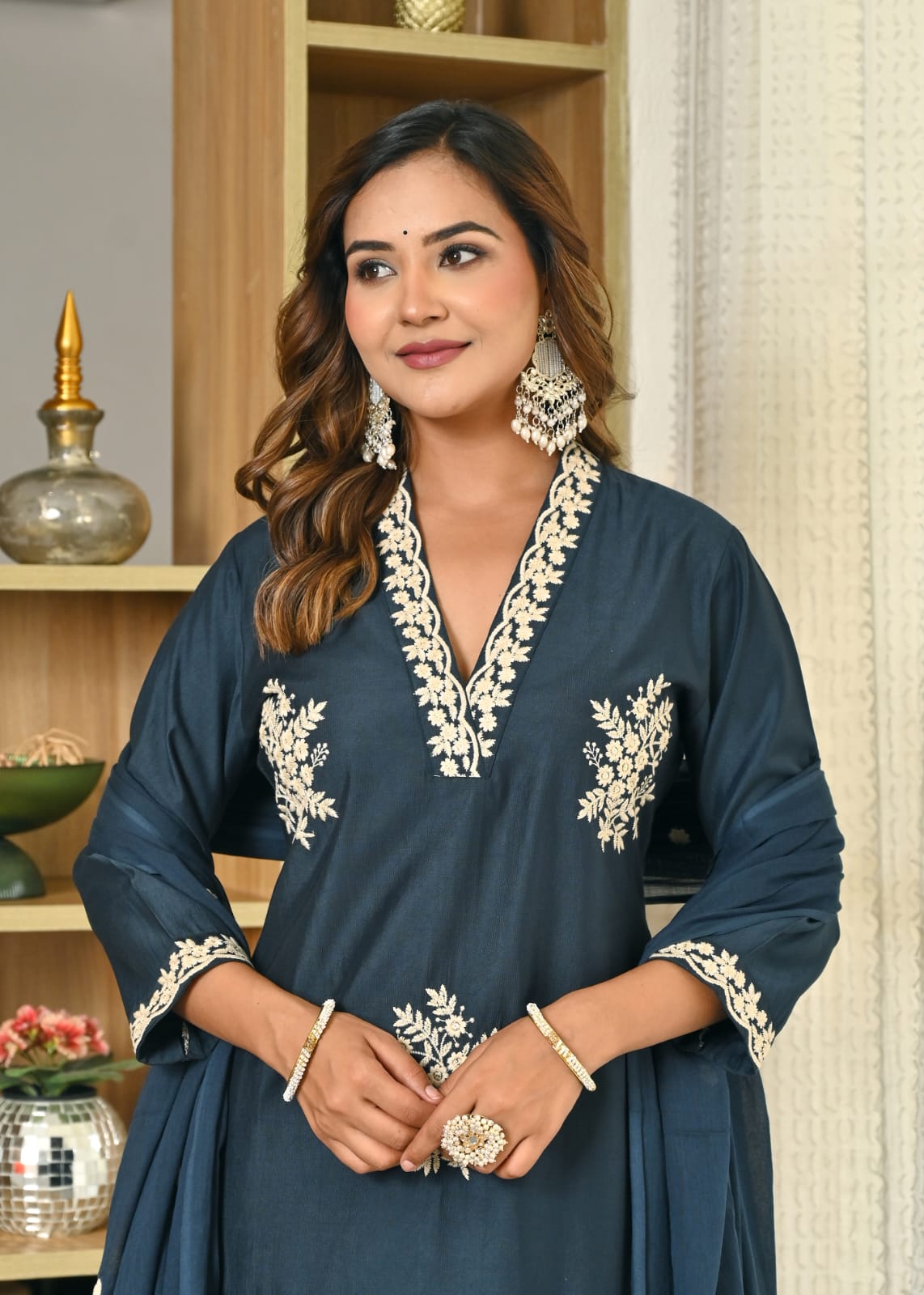 Bring timeless elegance to your wardrobe with this Uvula Navy Blue Embroidered Suit Set. Crafted from soft, breathable cotton, this outfit features a beautifully embroidered kurta with intricate threadwork on the neckline, sleeves, and front panel. The rich navy blue tone adds sophistication, while the lightweight embroidered dupatta completes the look with graceful charm.