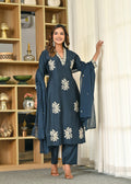 Navy Blue Embroidered Cotton Suit Set with Dupatta
