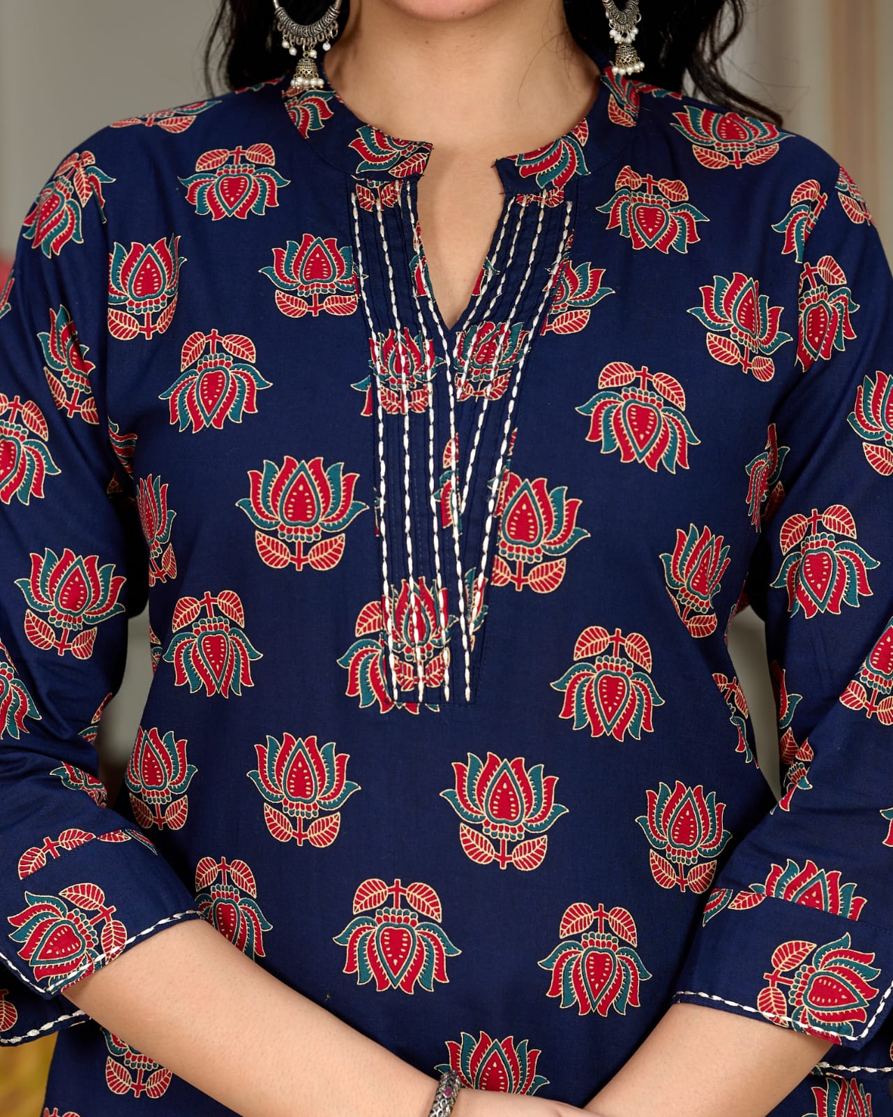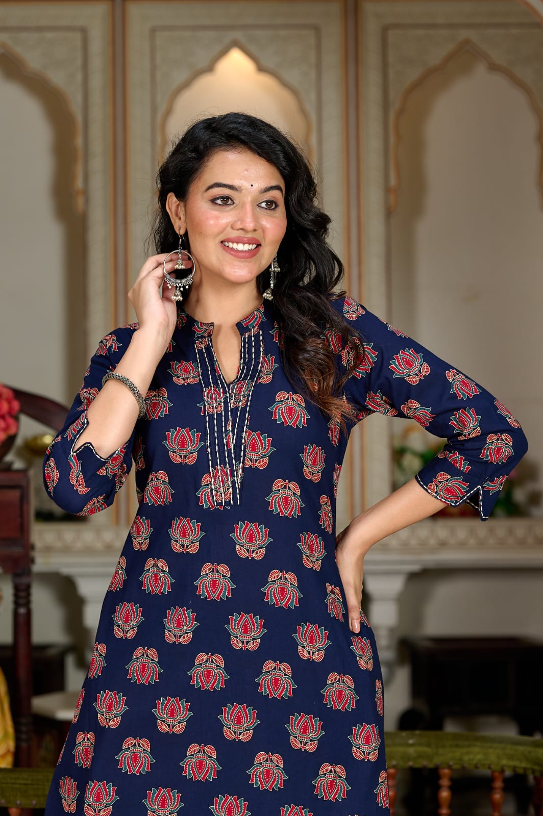Step into elegance with this navy blue A-line kurti set, beautifully adorned with traditional floral prints in vibrant tones. Designed for style and comfort, this ensemble features a flattering silhouette paired with matching palazzo pants, offering effortless ethnic charm. The embroidered neckline adds a hint of sophistication, making it a perfect choice for festive gatherings, office wear, and family events.