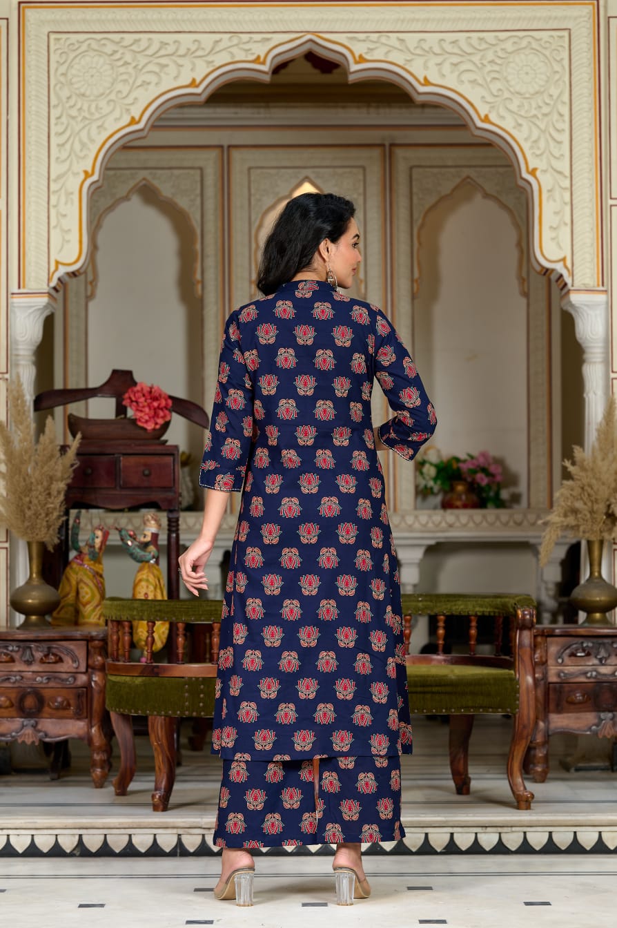 Navy Blue Printed A-Line Kurti with Palazzo Set