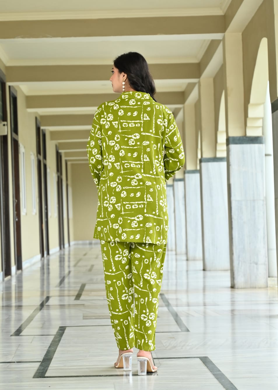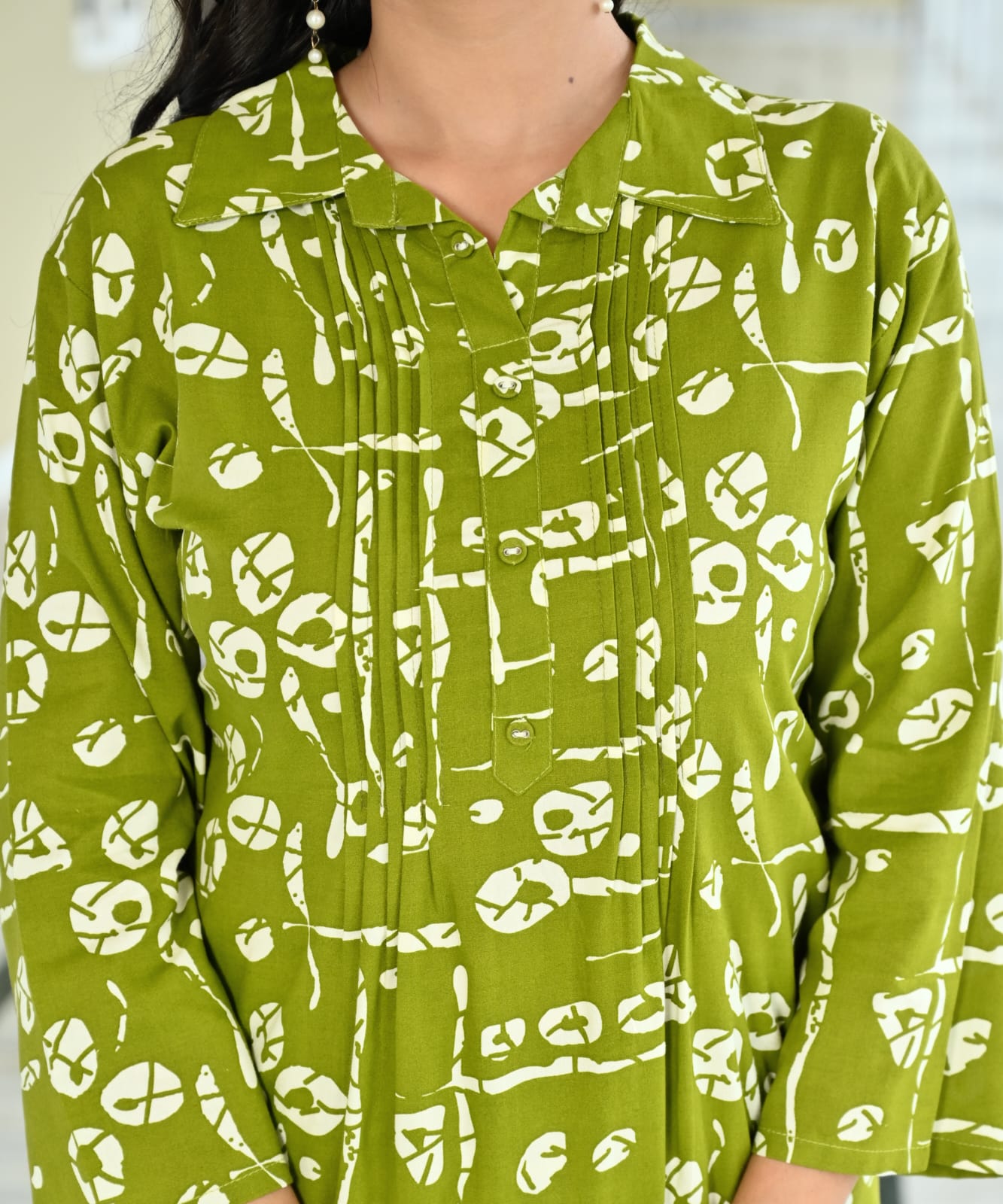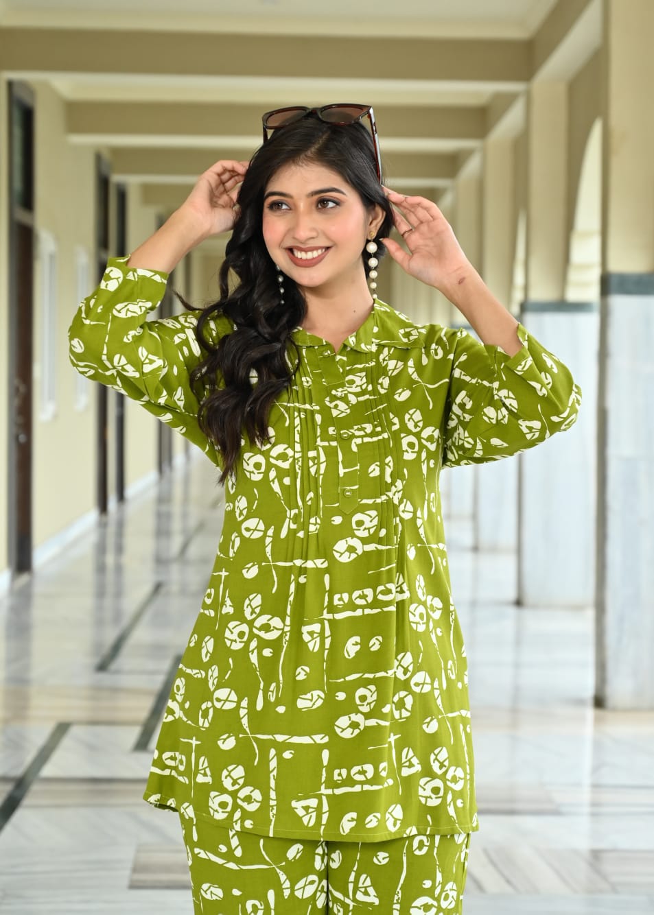 Add a splash of refreshing charm to your wardrobe with this Olive Green Printed Cotton Co-ord Set from UVULA. Designed for all-day comfort and effortless style, this co-ord set is crafted from premium-quality breathable cotton, featuring a chic geometric floral print in soothing white tones.