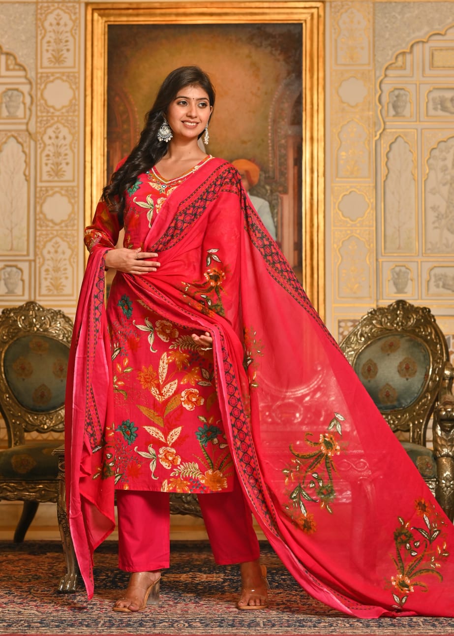 Pink Floral Printed Cotton Suit Set with Dupatta