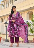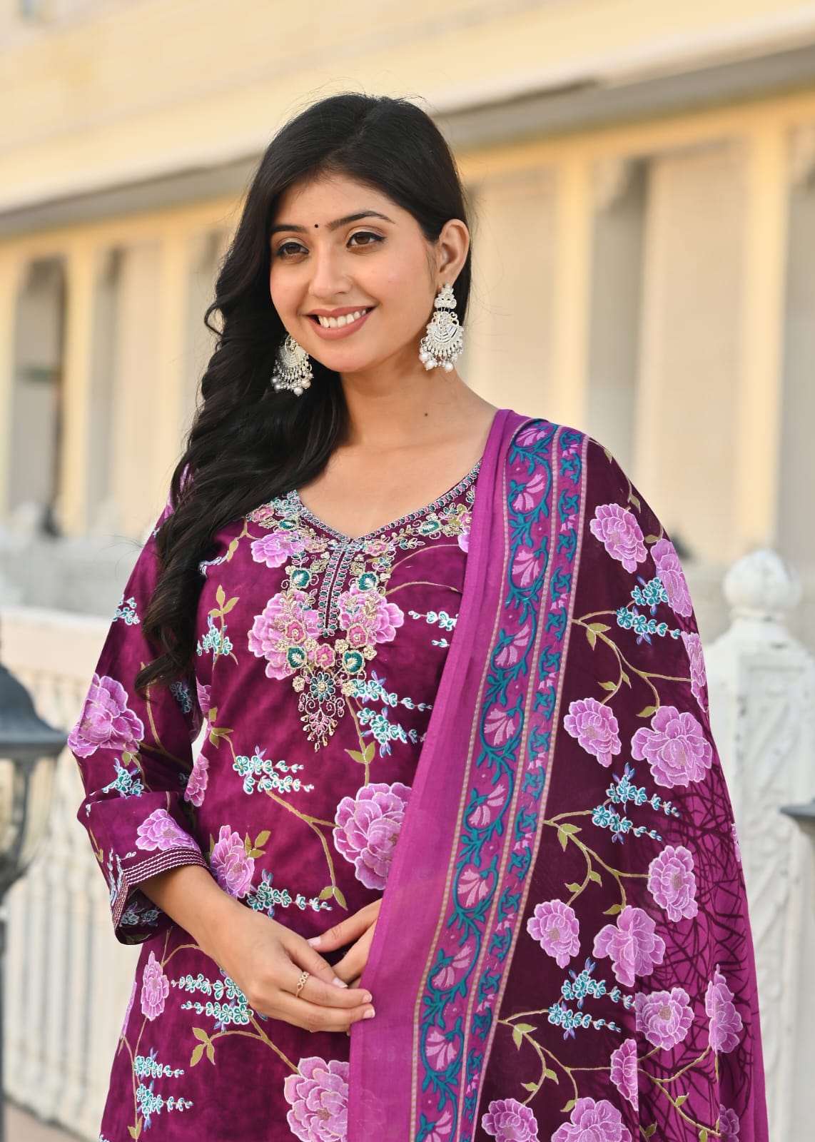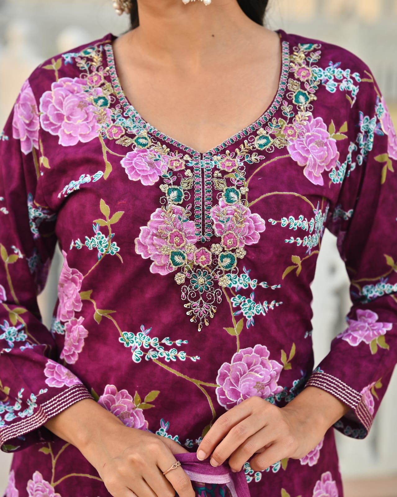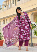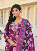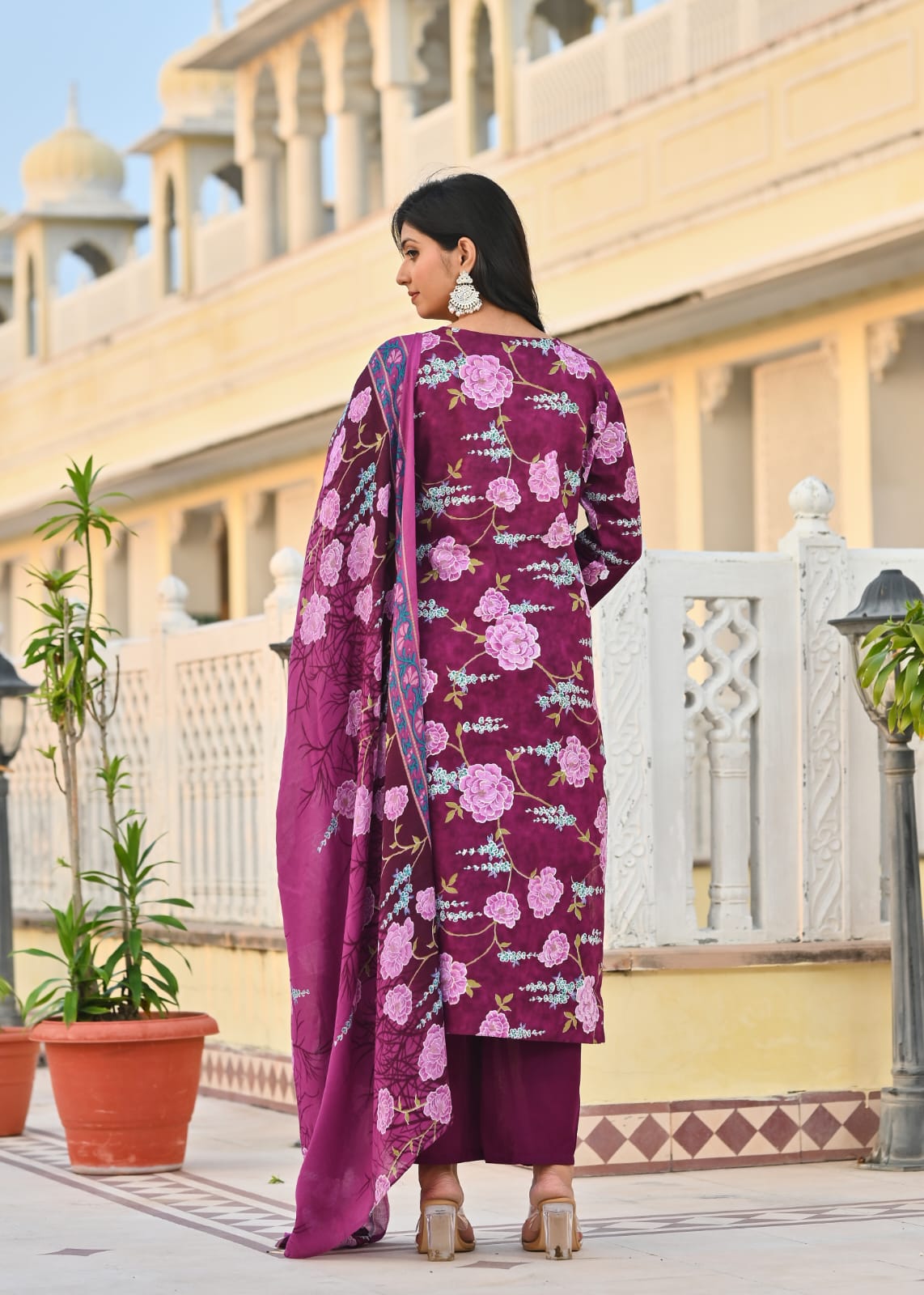 Plum Purple Floral Printed Cotton Suit Set with Dupatta