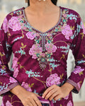 Add a royal touch to your ethnic wardrobe with this Uvula Plum Purple Floral Printed Cotton Suit Set. Designed in a luxurious plum shade, this ensemble features intricate floral prints and delicate embroidery detailing on the neckline. The premium cotton fabric ensures comfort and breathability, making it a perfect choice for festive occasions, family gatherings, or casual outings.