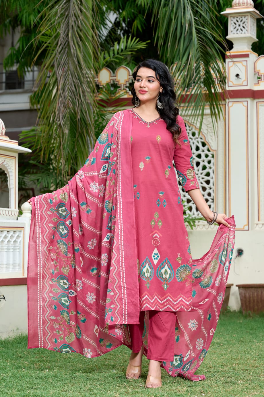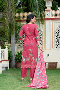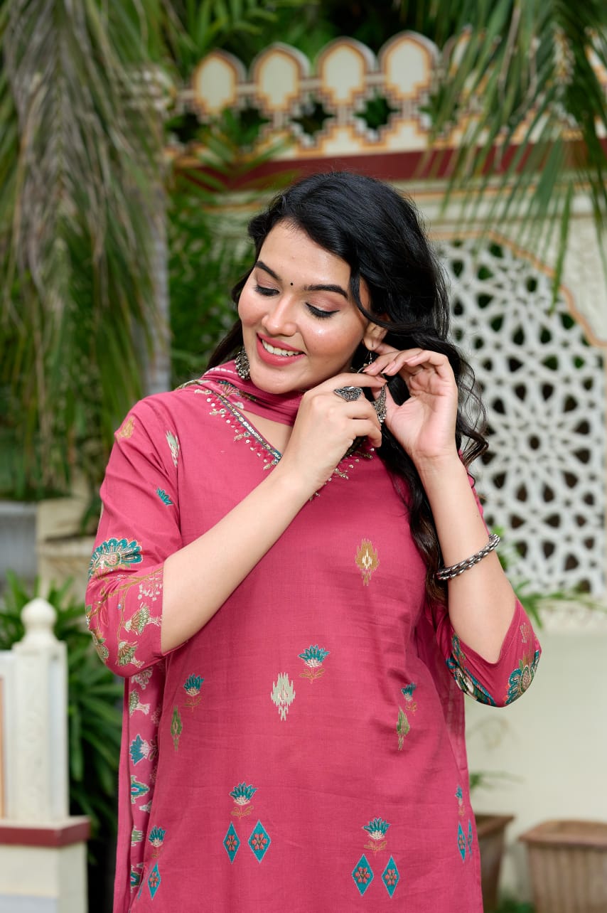 Step into effortless elegance with this rosy mauve 3-piece unstitched lawn suit, beautifully crafted with intricate ethnic prints and delicate embroidery. The kurta features eye-catching motifs that reflect traditional artistry, while the matching printed dupatta adds a graceful flow to the ensemble. Paired with a solid trouser, this outfit is perfect for festive occasions, casual gatherings, and everyday elegance.