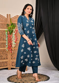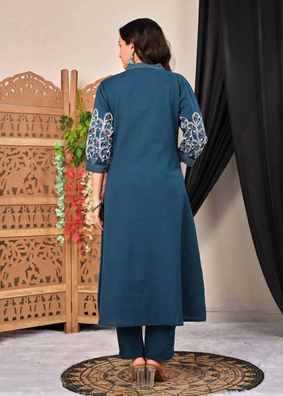 Teal Blue Printed Cotton Suit Set with Embroidered Sleeves