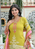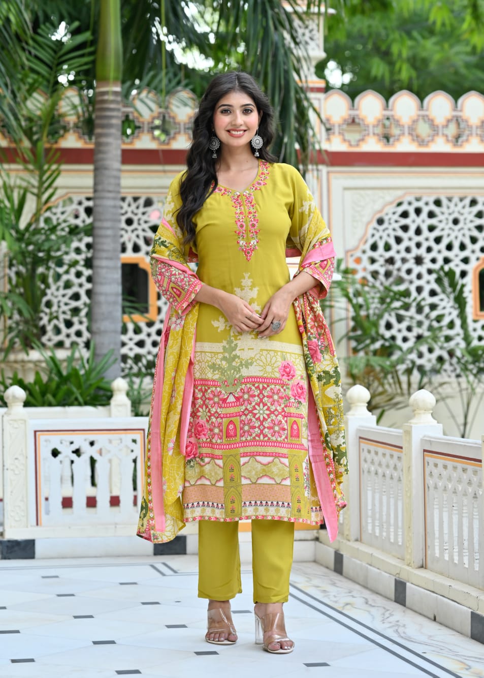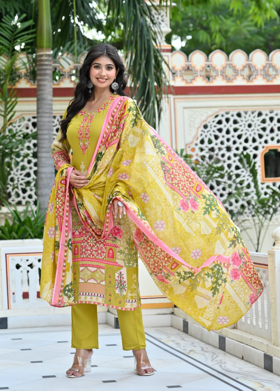 Step into elegance with this beautifully crafted 3-piece unstitched lawn suit, designed to brighten your wardrobe with vibrant hues and intricate detailing. The outfit features a stunning mustard yellow base adorned with floral embroidery on the neckline and sleeves, paired with a striking multicolor digital printed dupatta highlighted with shades of pink and green. Soft, breathable fabric ensures all-day comfort, making it perfect for festive occasions, casual outings, and summer gatherings.